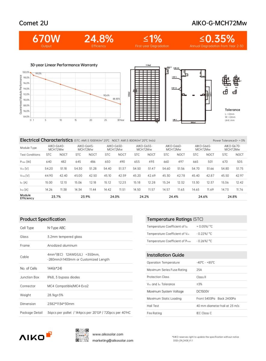 Tấm pin AIKO 640W thuộc dòng Neostar/Comet, đại diện cho công nghệ quang điện tiên tiến nhất hiện nay. Với việc loại bỏ hoàn toàn các đường hàn ở mặt trước và tối ưu hóa cấu trúc cell pin, AIKO 640W không chỉ mang lại vẻ đẹp đẳng cấp mà còn sở hữu hiệu suất vận hành kỷ lục.